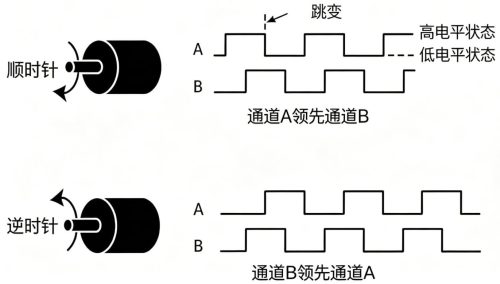 A 相、B 相:相位差 90°,用来判断旋转方向