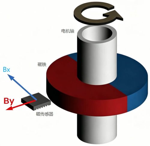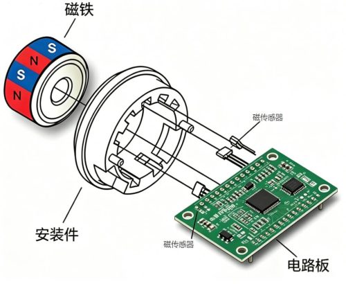 电磁式编码器原理:磁铁 + 霍尔/ 磁传感器,检测磁场变化